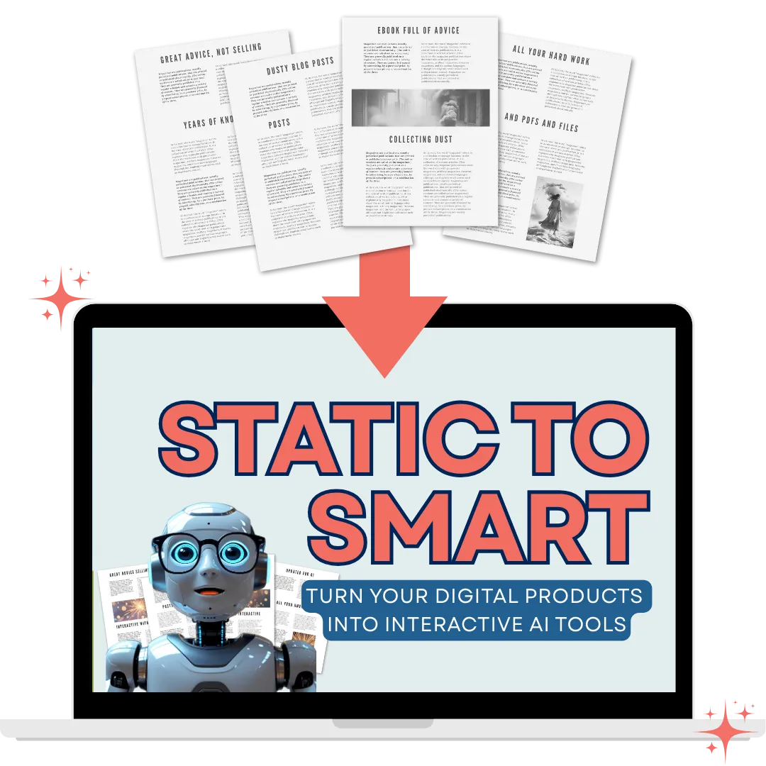 Due to the nature of the product there are no refunds. We will work with you step by step to make sure Static to Smart turns your old content into valuable, interactive AI wizards you can sell.