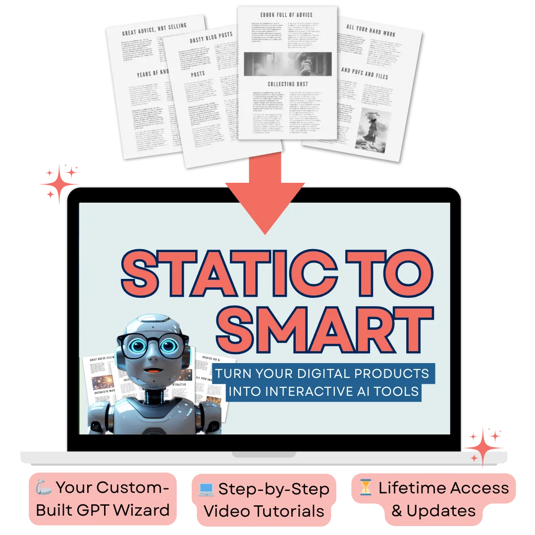 Static to Smart will ask you a few questions about your content, and in just 10 minutes it will have created a GPT wizard for you that helps your audience implement your framework or process.